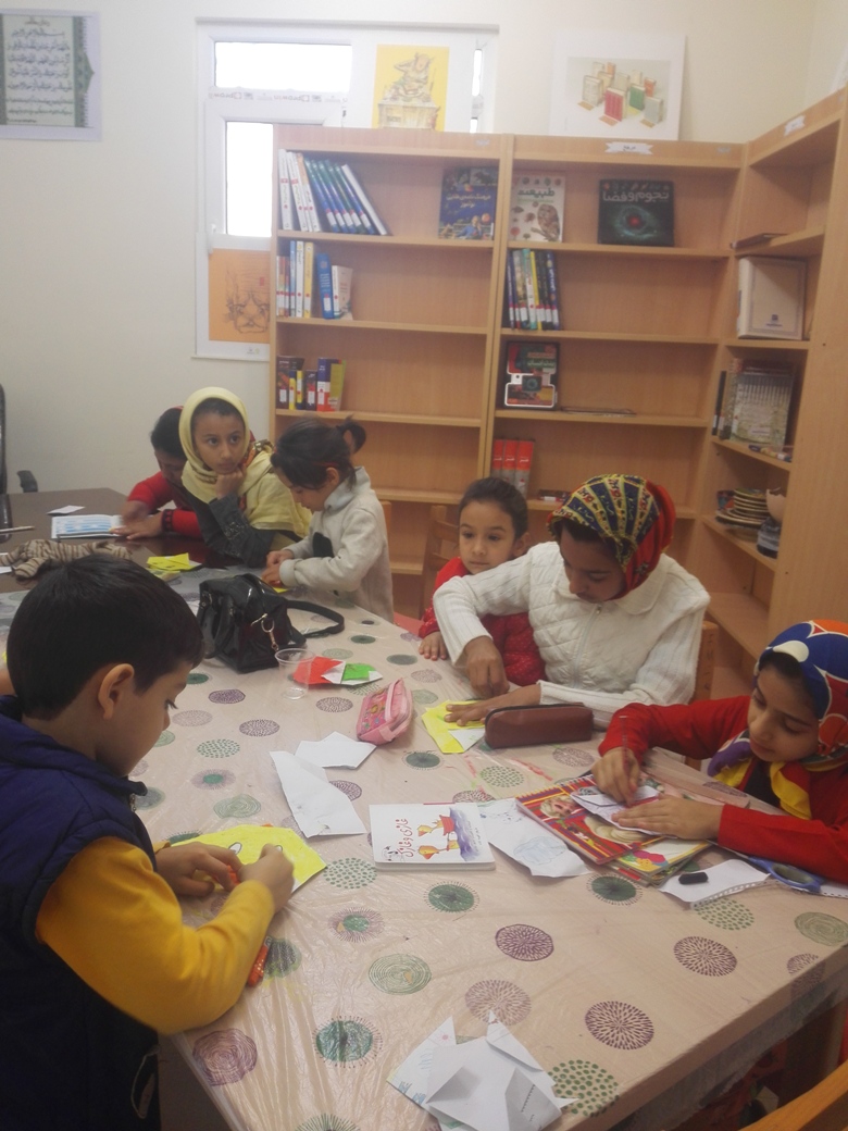 اوریگامی توسط مسئول کتابخانه به کودکان عضو کتابخانه شهید سید احمد موسوی کربلایی آموزش داده می شود.